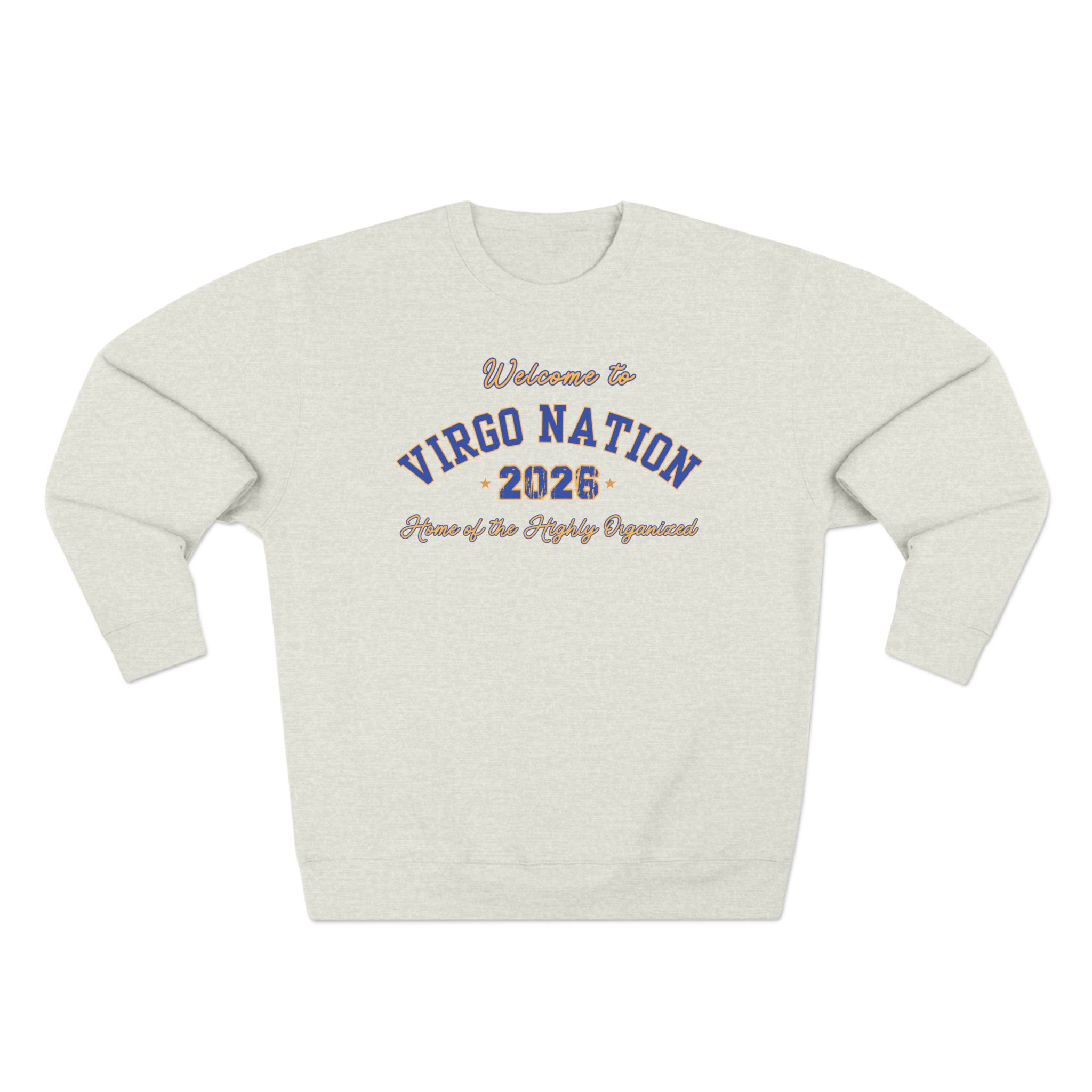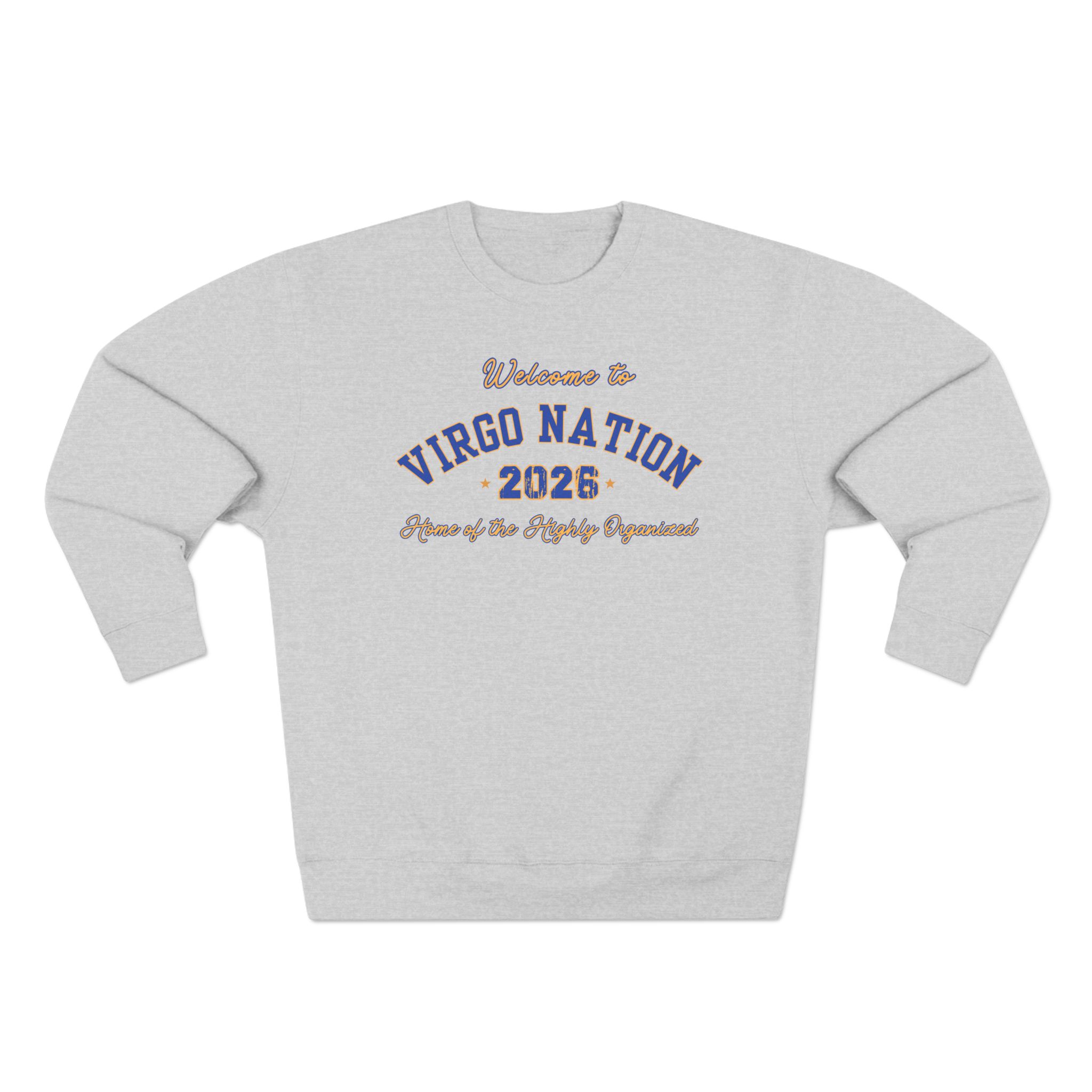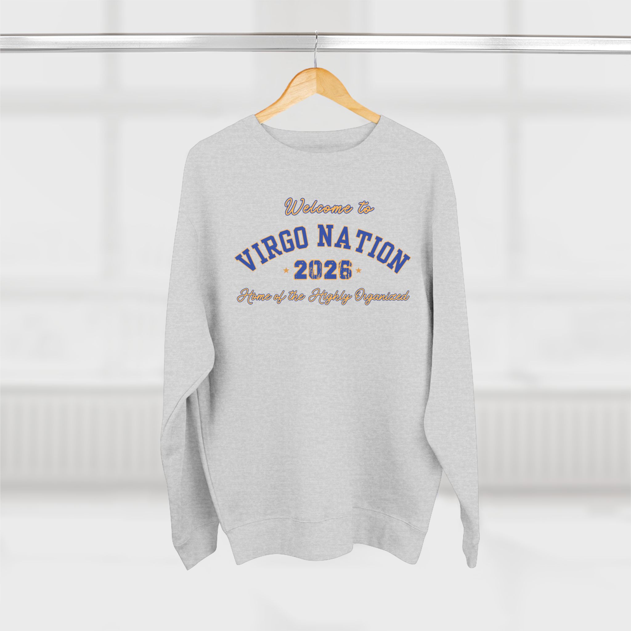 A cozy Virgo Nation collegiate zodiac sweatshirt perfect for those who love astrology. This sweatshirt provides warmth and comfort, making it ideal for lounging or casual outings. Great for Virgo birthdays or astrology enthusiasts.